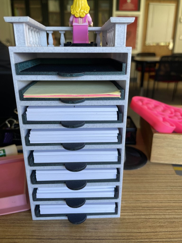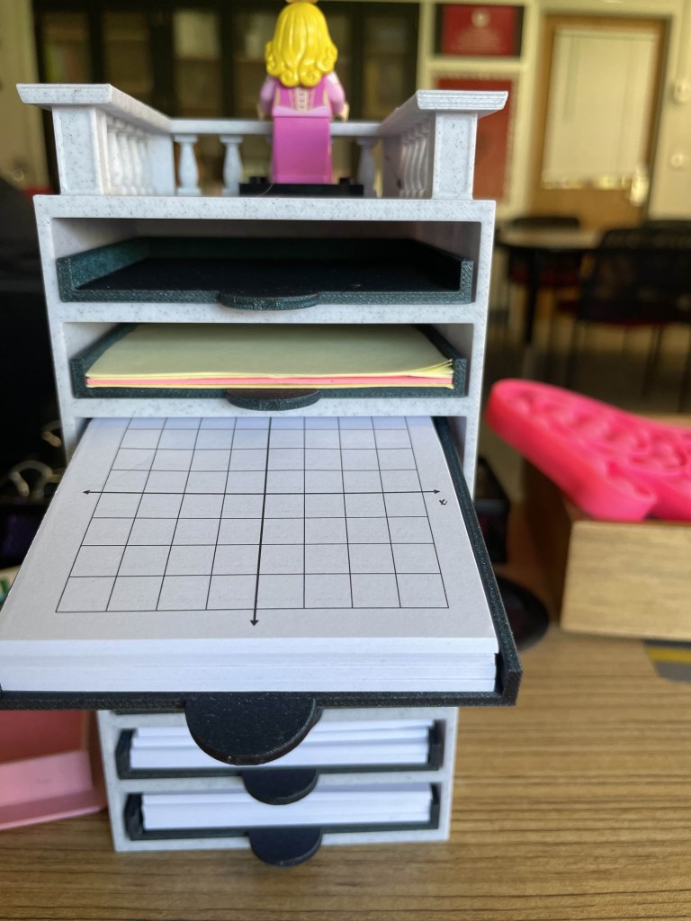 I was commissioned in the summer of 2025 about whether I would be able to design and print a castle-themed Post-It Note organizer with space at the top for a small Lego princess Minifigure.