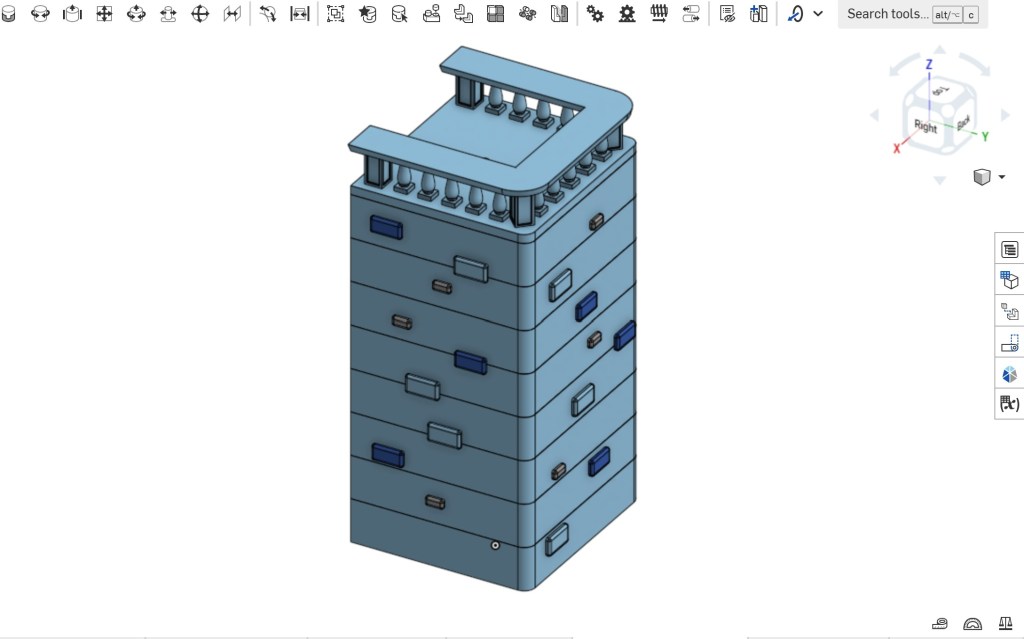 While the client specified the castle theme, I was given a lot of creative freedom in the design. In OnShape, I created a Post-It Note organizer with space for eight Post-It Note pads. On the outside I added bricks in three sizes and on the top of the tower I modeled a small balcony, sized for a Lego Minifigure to stand and look out from the tower.