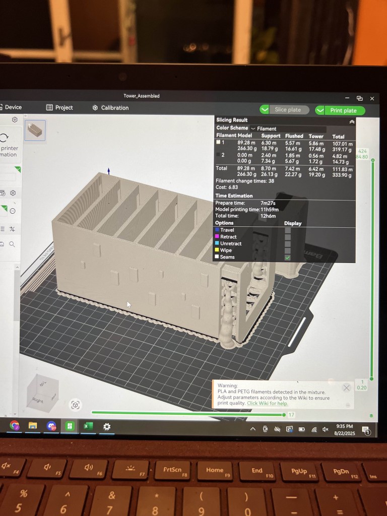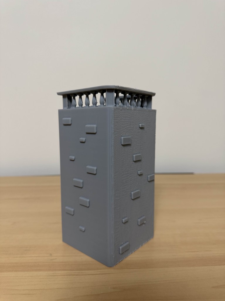Print orientation as well as playing with tolerances were the main challenges with this project. The first print of the whole tower I printed it with minimal supports but the surface on the print bed was a different texture than the other walls. In the second and final print I reoriented the tower and it printed very cleanly.