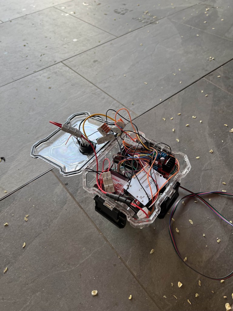 ANGLER is a simple design: with a chassis made out of a commercially available waterproof box, the only external components of the robot are its 12v propeller motors, the power switch, a water temperature sensor, and the tether connecting ANGLER to our remote controller. Within the chassis sits the motor controller, an LCD readout screen for sensor readings, the battery packs, and the Arduino microcontroller. We did not have depth control on ANGLER, since this was our first foray into ROVs, and thus we relied on the chassis’s buoyancy to keep it afloat. Our goal was to deploy ANGLER in an Olympic sized swimming pool and navigate around and collect temperature readings of the water.